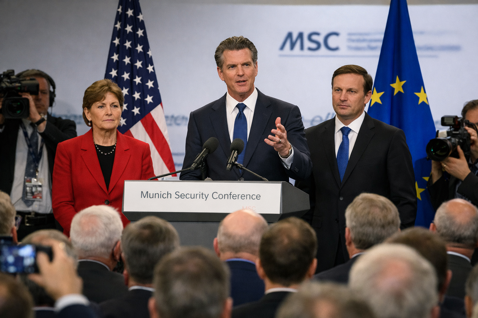 Speaking at side events and panels at the 2026 Munich Security Conference, California Governor Gavin Newsom — a leading Democratic voice and possible future presidential contender — offered a blunt reassurance to anxious European officials and audiences. “Donald Trump is temporary. He’ll be gone in three years,” Newsom said, suggesting that the prospects of a different U.S. political direction could reassure long‑standing partners shaken by recent policy shifts.